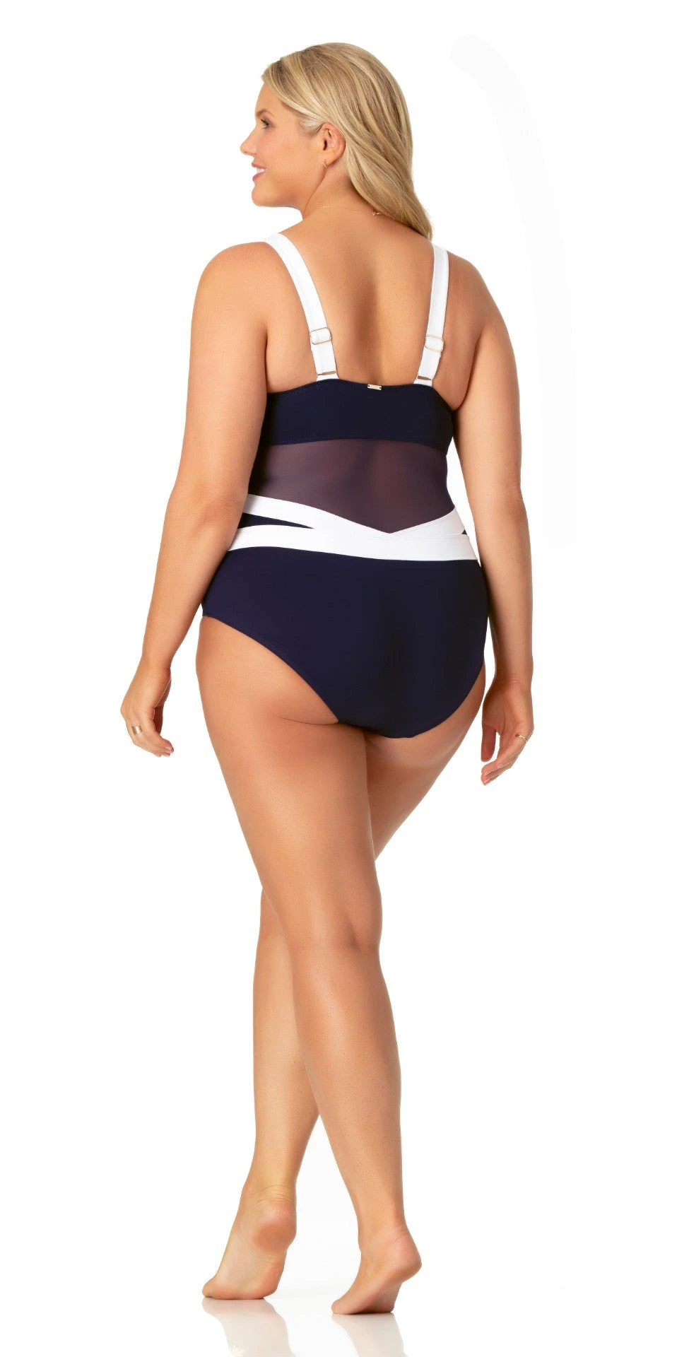 Anne Cole Asymmetric Spliced Mesh One Piece Swimsuit 20PO02002 Navy