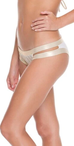 This Luli Fama Desert Babe Banded Moderate Bottom offers gold metallic fabric with a textured net overlay. This bottom offers double strap, split sides and a moderate cut. Shop the matching top HERE