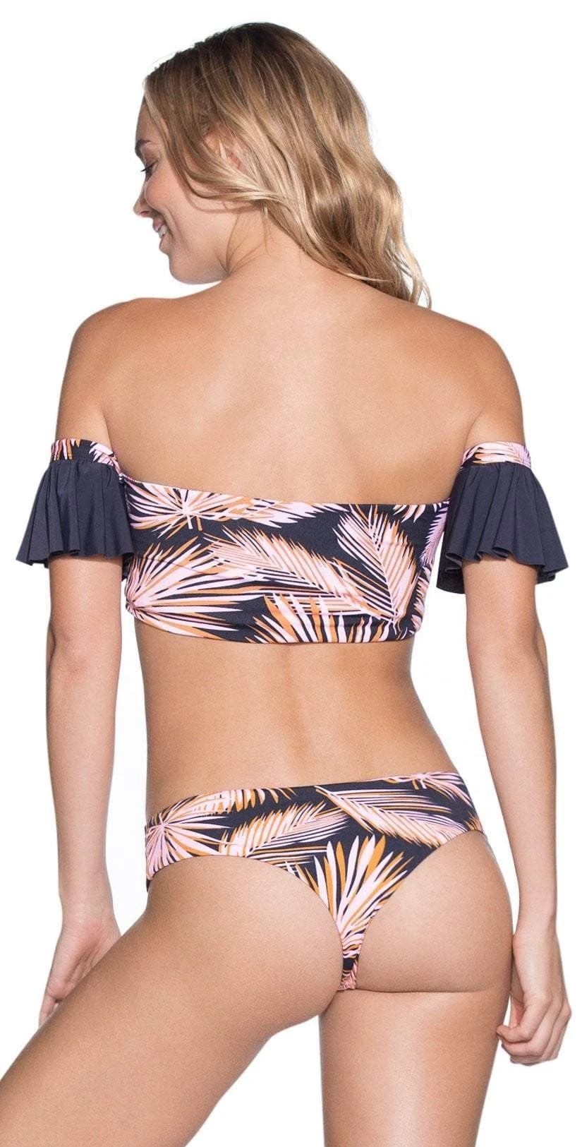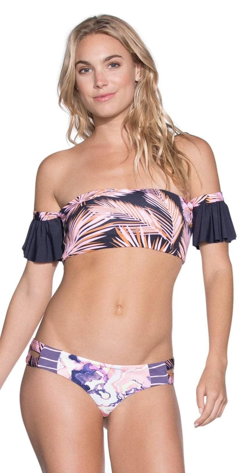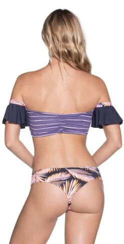 The Maaji Colombian Paradise Off the Shoulder Top offers a bandeau style, pull over top with an off the shoulder flutter sleeve silhouette. This top reverses from a stripe to a palm print with removable soft cups. Pair with the matching Colombian Paradise bottom.