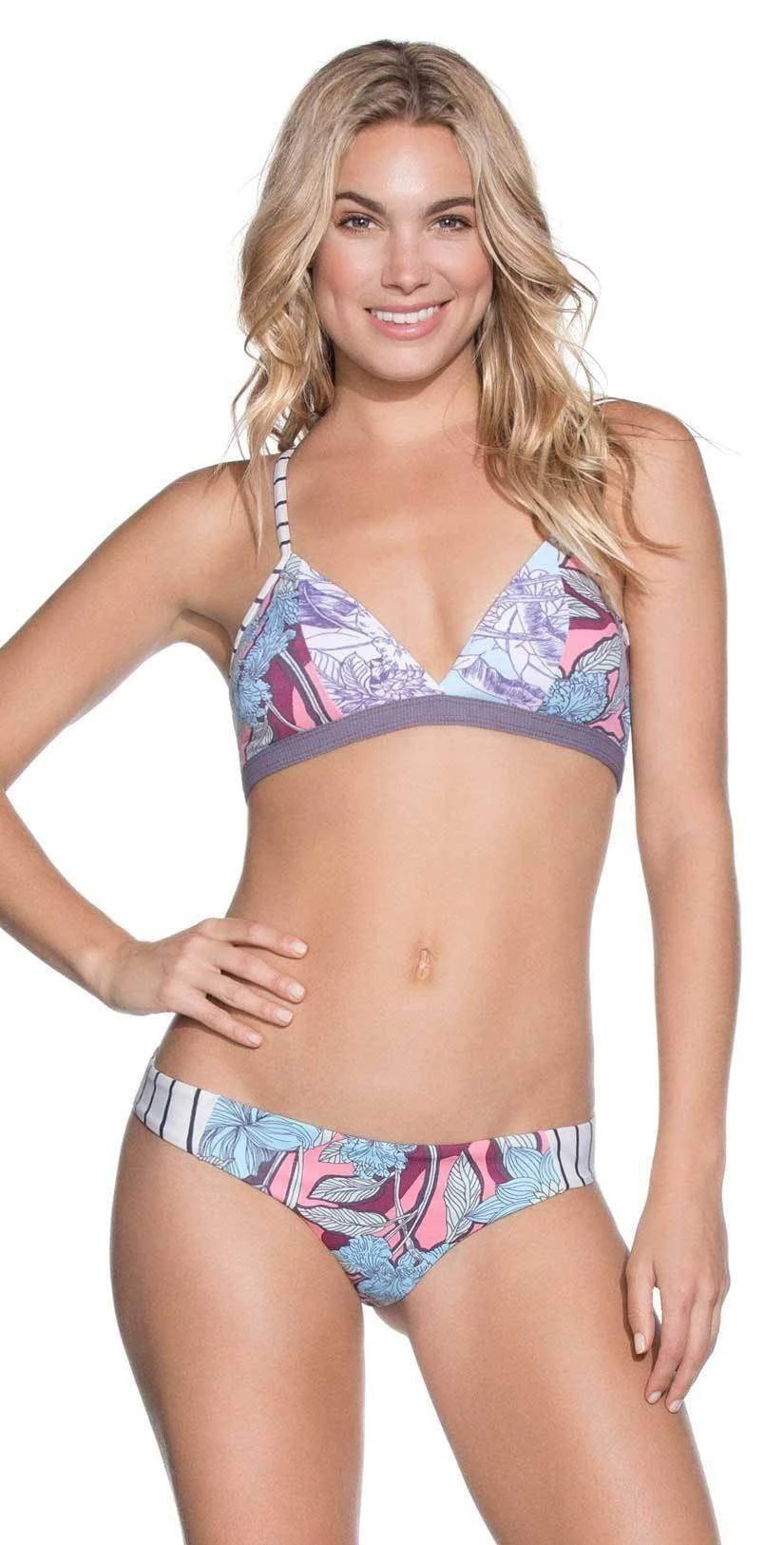 The Maaji Gorgona Spell Reversible Bottom features a mixed print front with a solid textured purple back. This low-rise hipster bottom pairs with the matching Charmed Island Lagoon Cumbia top.