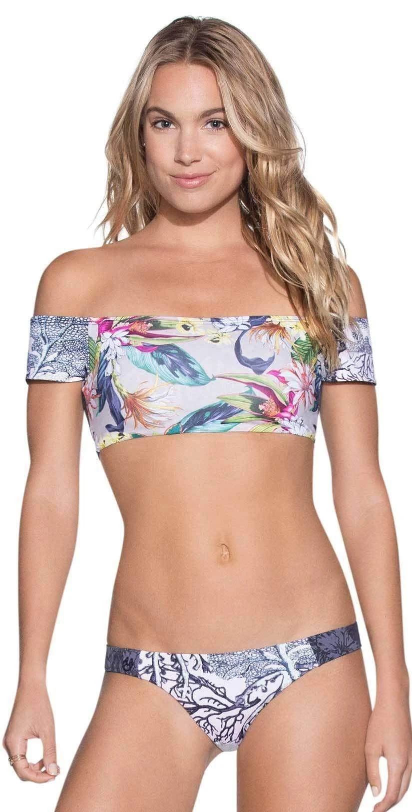 The Maaji Sula Sula Reversible Top is an off the shoulder top with a tropical pattern. This top is a pull over style and offers sewn in soft cups and ruching at the center bust. Pair this cute top with the matching Maaji Sula Sula Reversible Bottom.