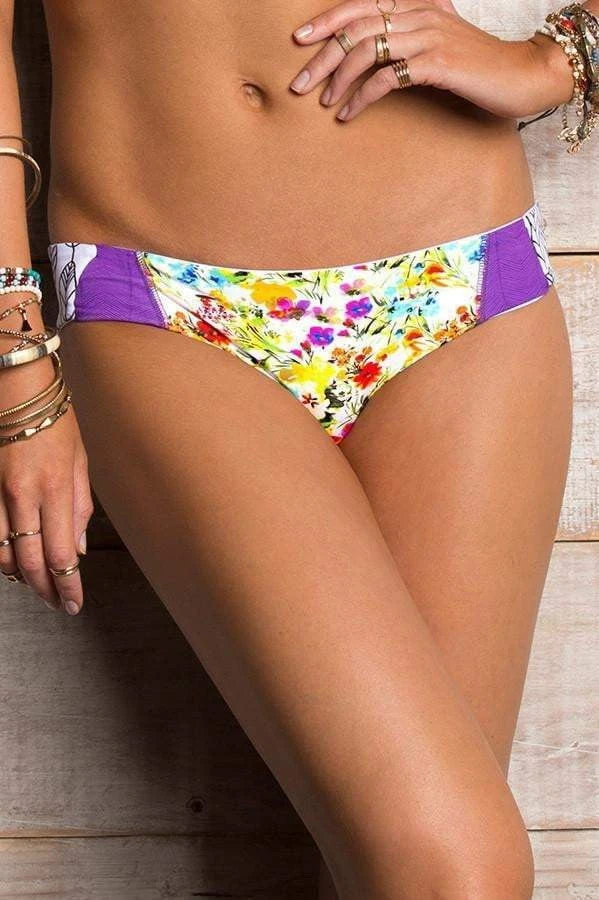 The Maylana Bodni Floweret Hipster Bottom is a reversible, low-rise hipster cut bottom that offers a feather print on one side and a solid purple zig zag pattern on the other and offers cheeky back coverage. These bottoms pair with the matching Imani Floweret Top or the Kali Floweret Bralette Top.