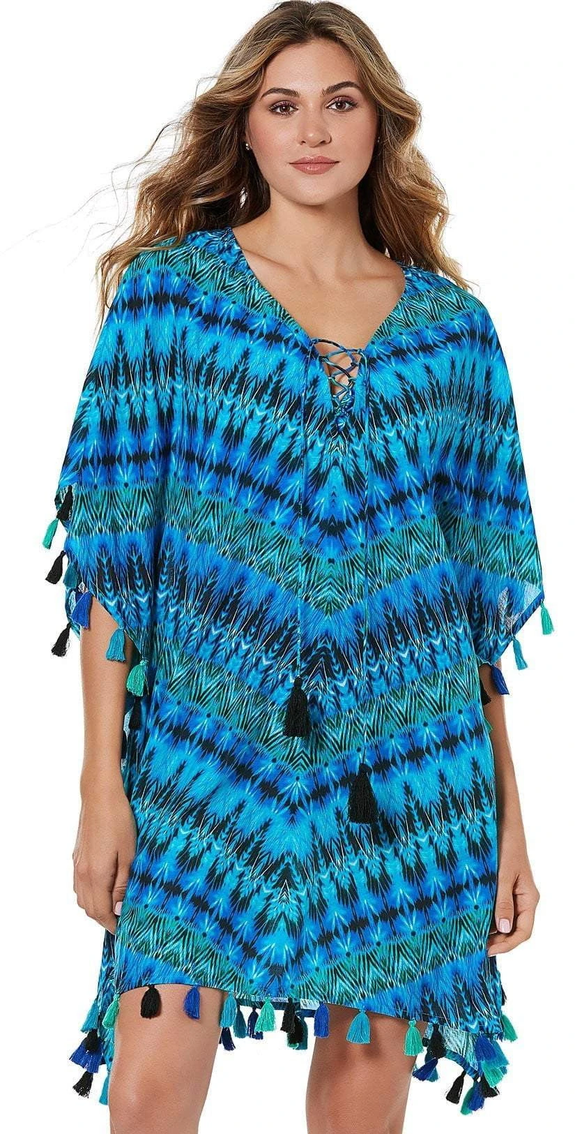 The Miraclesuit Cabana Chic Caftan is a pull over caftan with a lace up front detail. This caftan is chic and comfortable. Pair with the matching Cabana Chic Blue Peephole Tankini Top.