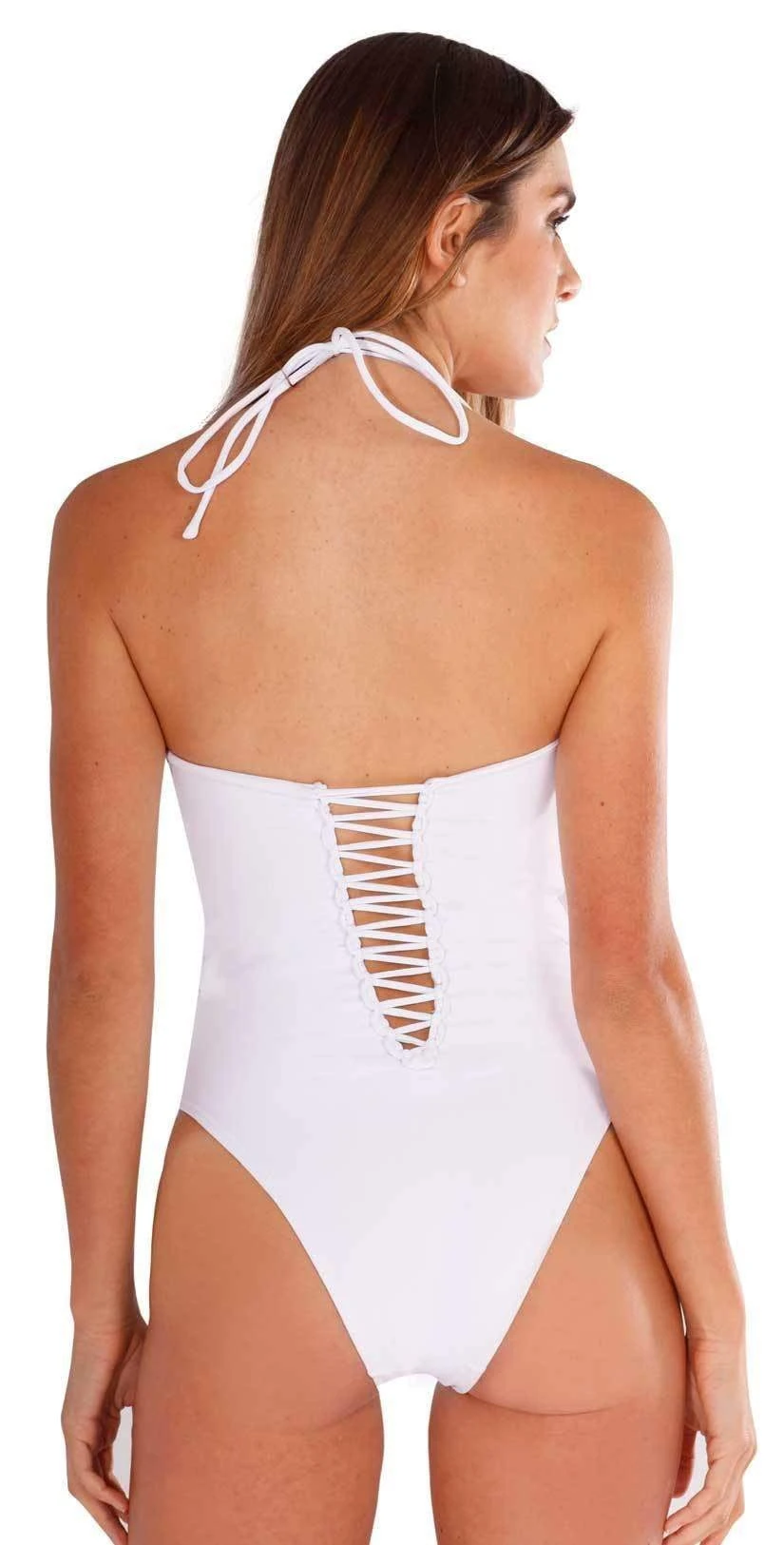 The Peixoto Paloma One Piece is an all white swimsuit with macrame detail along front of suit. The back macrame detail forms a v down to the lower back. This one piece is sexy and offers full bottom coverage.