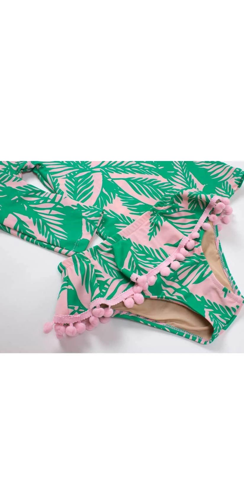 Protect your mini-me from the sun’s harsh rays in this adorable palm print rashguard set from Shade Critters. The top features long sleeves and a mock neck for extra skin coverage. The bottoms offer a cute pom pom embellishment and offers full coverage.