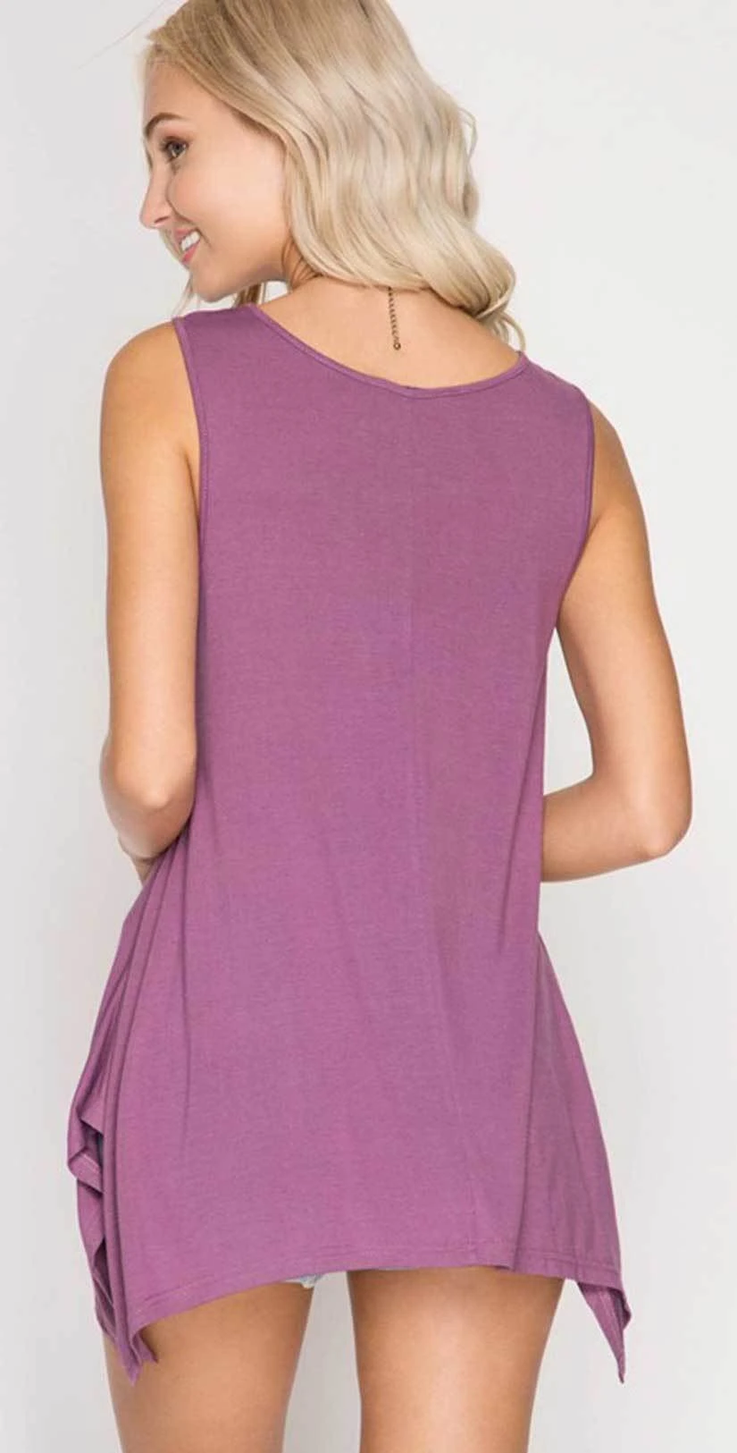 The She + Sky Sleeveless Top with Braided Cutout Detail is a mauve top with cuts out that are braided and has a high low hem. The shirt is perfectly paired with white jeans or with cut off short s to wear down to the beach.
