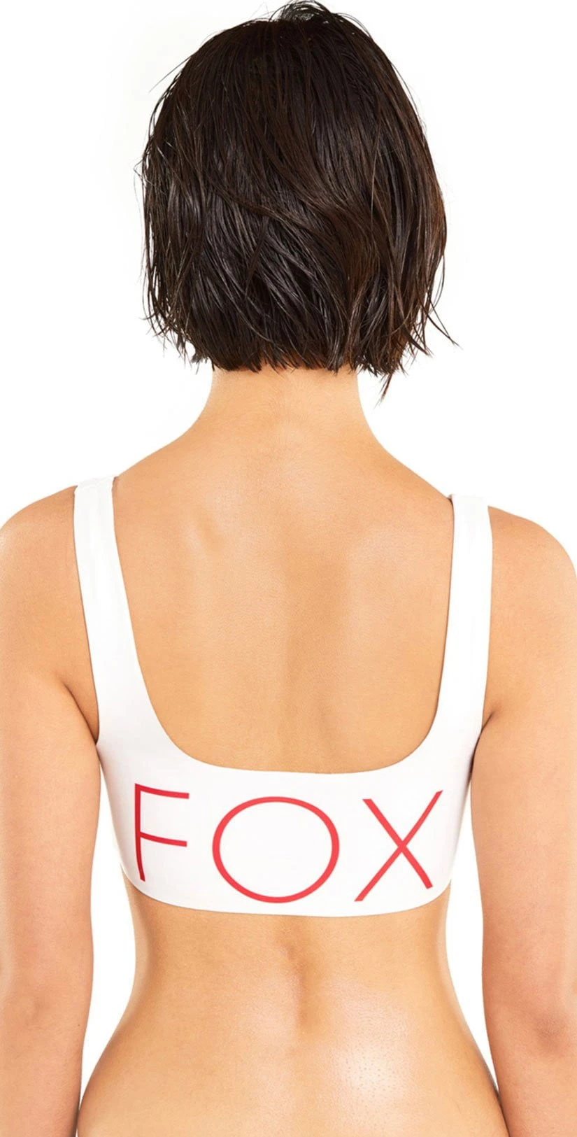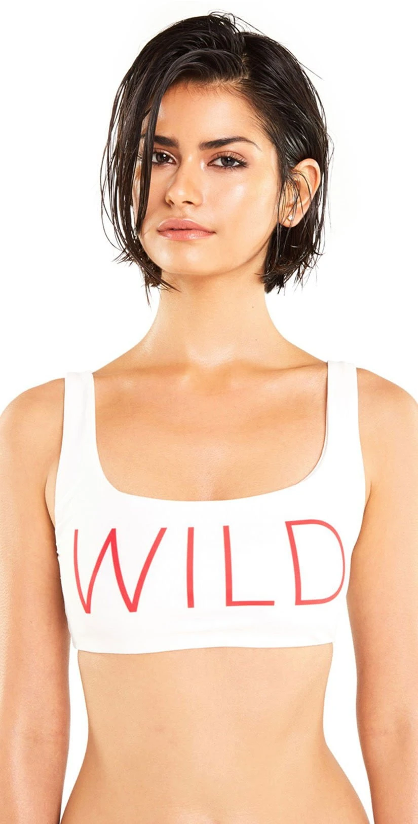 The Wildfox “Wild” Bikini Crop Top is a sporty white tank style top with red lettering “WILD” printed on the front and “FOX” printed on the back. Wide shoulder straps provide extra support while the scoop neckline flatters and exposes some cleavage for an overall sexy look. Pair with the matching Isabelle Bikini Bottom to complete the look!